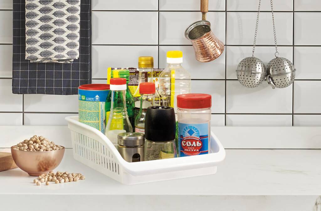 Возьмем лотки. Хранение утвари в них облегчают уборку поверхностей: не нужно поднимать каждую вещицу или баночку по отдельности, чтобы протереть. Да и пачкаются эти поверхности реже, часто достаточно вымыть лишь сам лоточек. Плюс все упорядочено и хорошо выглядит.