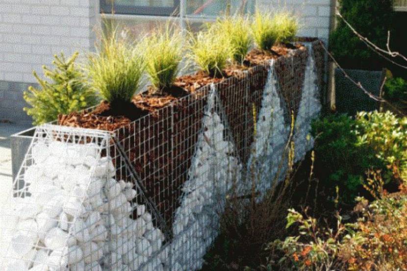 - Габионы, контейнеры из металлической сетки, заполненные камнями. Подходят для формирования клумб на участке с неровным рельефом.
