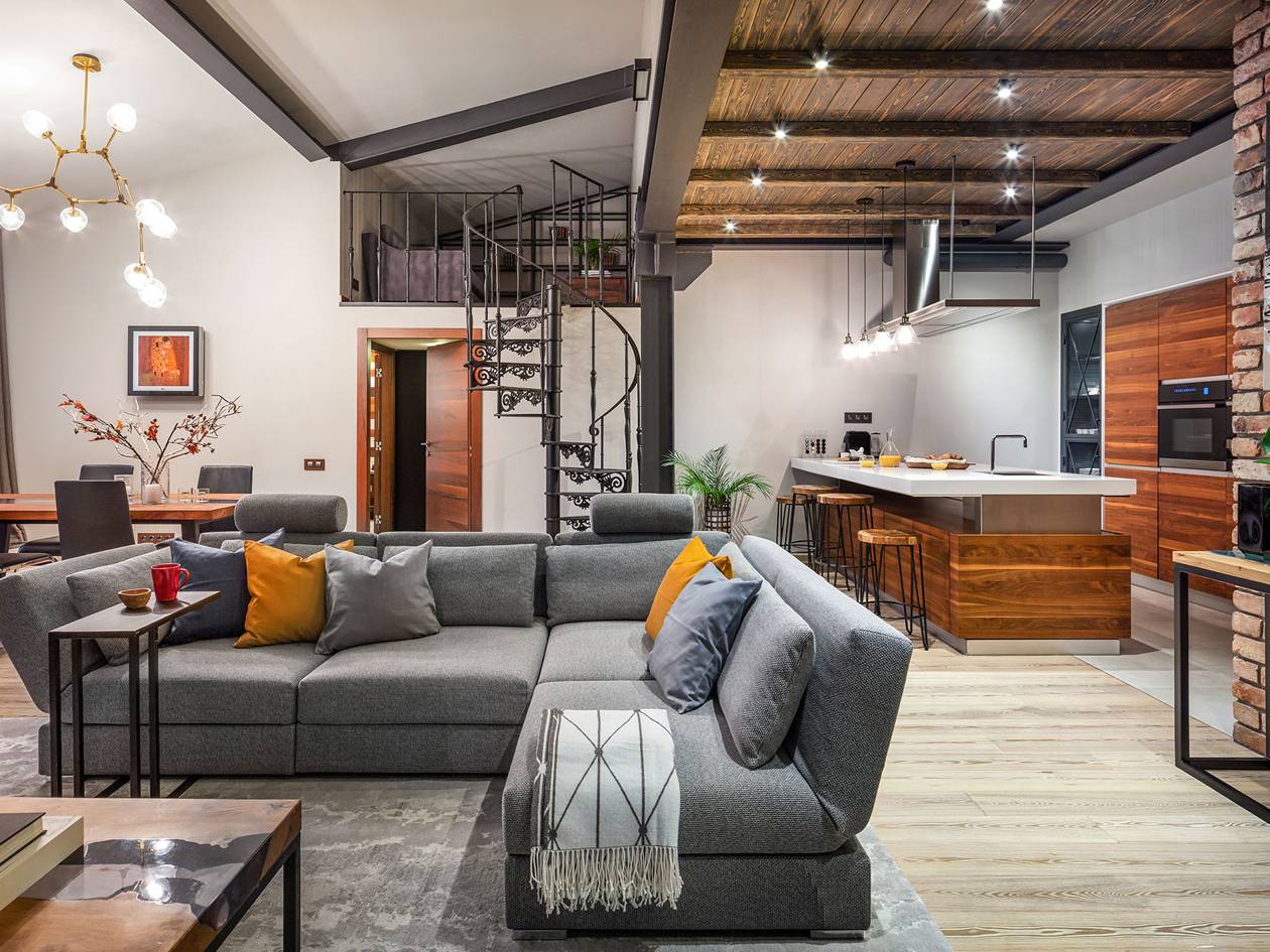 Смело можно сказать, что лофт – самый необычный и интересный стиль. Он отличается открытыми коммуникациями, отделкой из бетона и стекла, а также неизменной кирпичной кладкой. Если он выбран для оформления кухни-гостиной, то все остальное пространство в доме должно также ему соответствовать. Передать соответствующую атмосферу и разделить пространство помогут светильники. Подвесные металлические можно разместить в гостиной или над обеденным столом, а более компактные – на кухне.