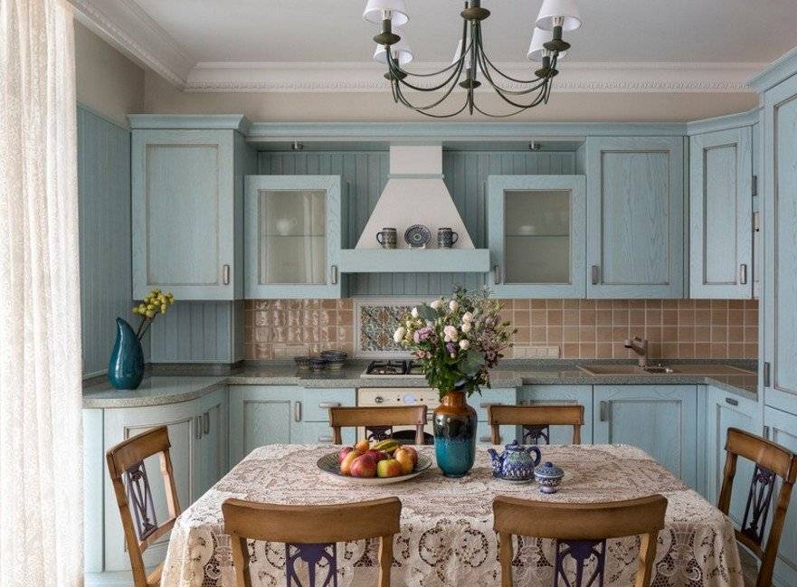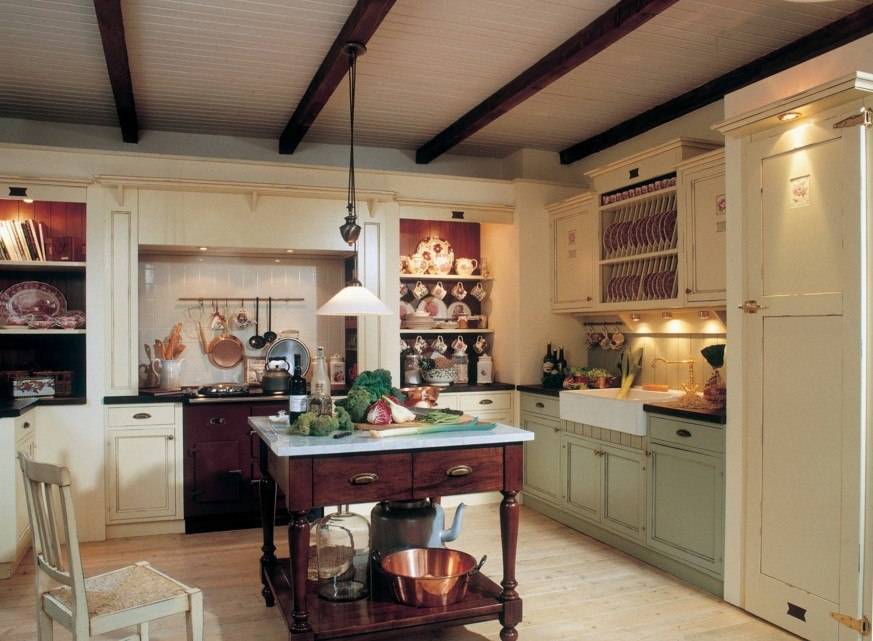 Основными признаками кантри-кухни можно назвать: столешницу из камня или дерева, открытые полки в шкафах, светильник с тканевым абажуром, текстиль (лен, ситец), деревянная или плетеная мебель. Цветы в горшках и вазах также гармонично впишутся с такой «природный» интерьер.