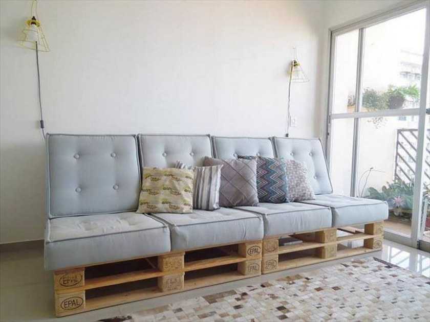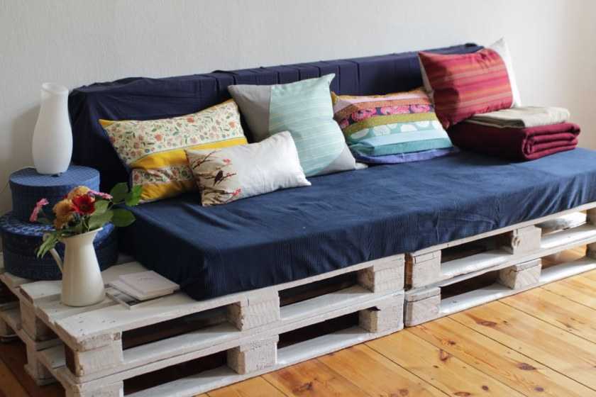 Мебель из поддонов рекомендуется дополнять мягкими сидениями и декоративными подушками. Так интерьер будет выглядеть более уютно