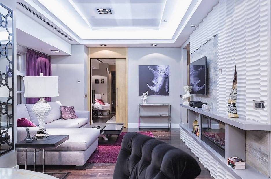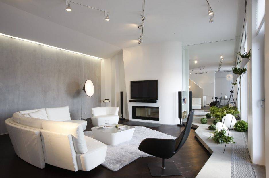 Стили модерн, техно и урбанистический характеризуют минимализм, сдержанность, четкость линий. В такие гостиные хорошо подойдут небольшие или стандартные электрокамины с простым обрамлением. Настенные панели и прозрачные стеклянные конструкции только подчеркнут простоту убранства, а наличие дополнительных функций: дистанционное управление, звуковые эффекты, подарят дополнительный комфорт.