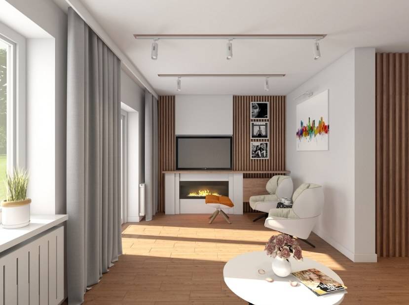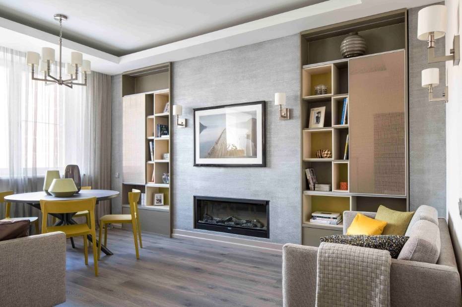 По мнению дизайнеров, в интерьере гостиной простой квартиры будет уместным и электрический камин. Лучше отдавать предпочтение самым компактным и встроенным моделям. Они идеально дополнят дизайн и в целом не займут много места. Кроме того, надо позаботиться и о правильной расстановке мебели. Ведь для камина надо освободить максимум свободного пространства.