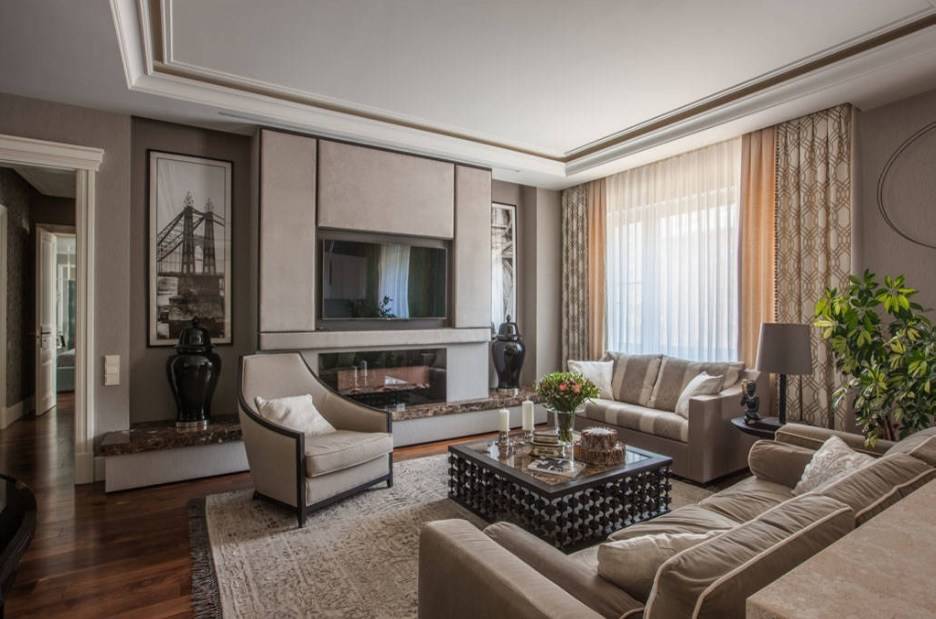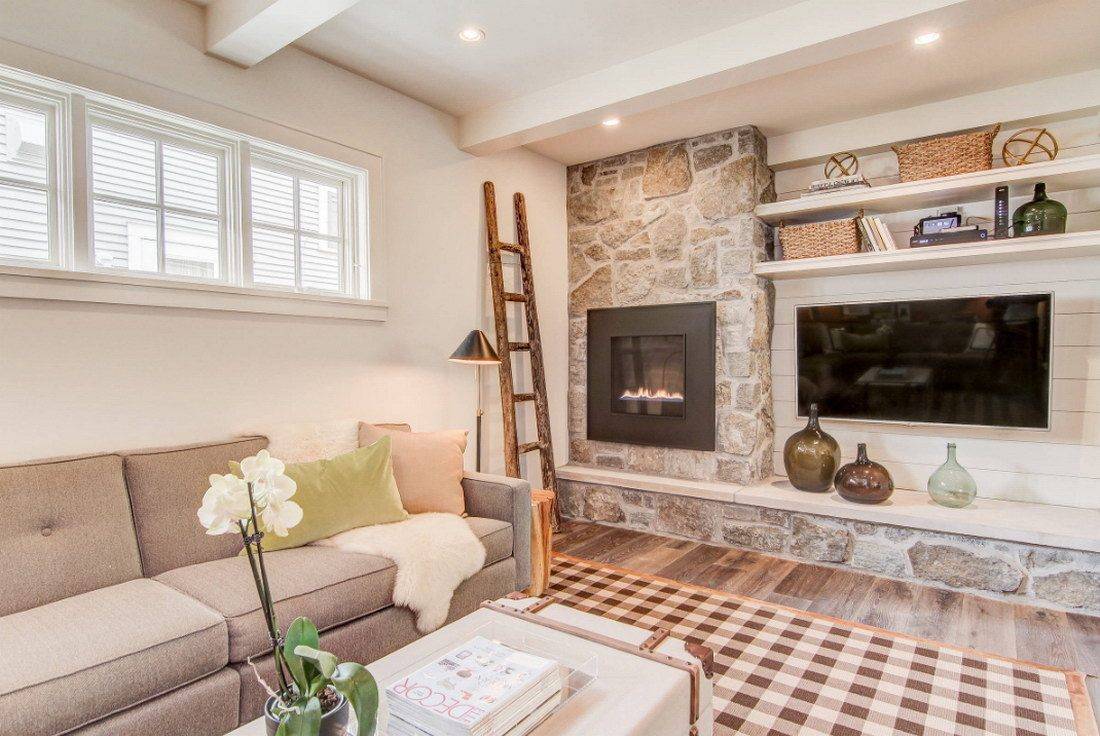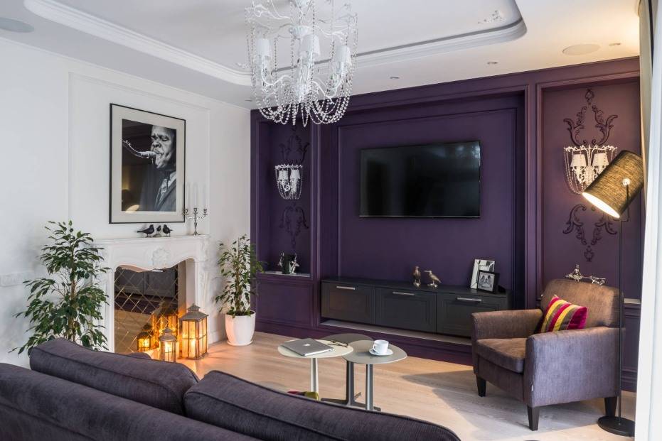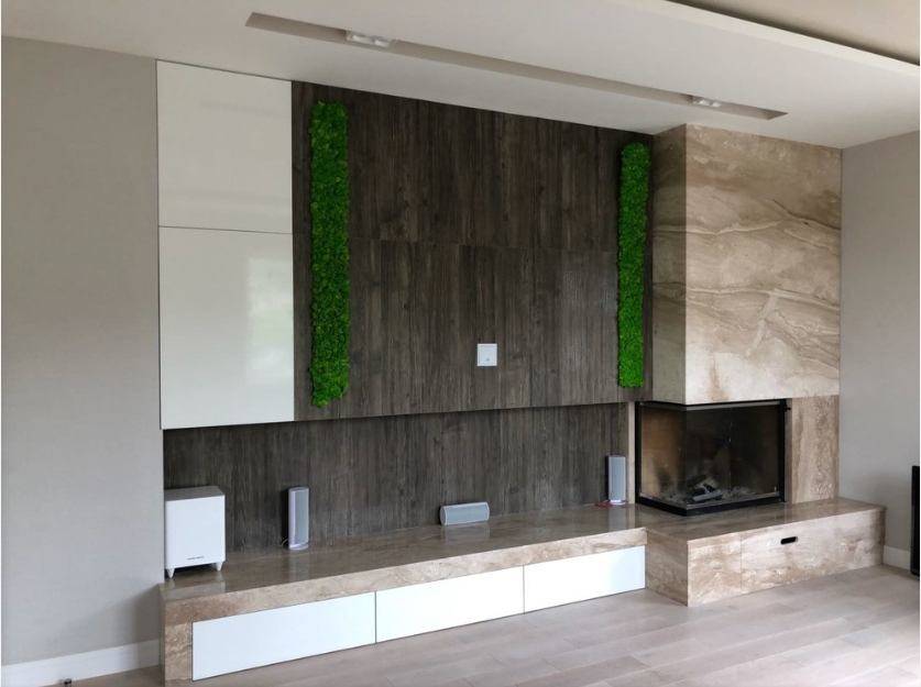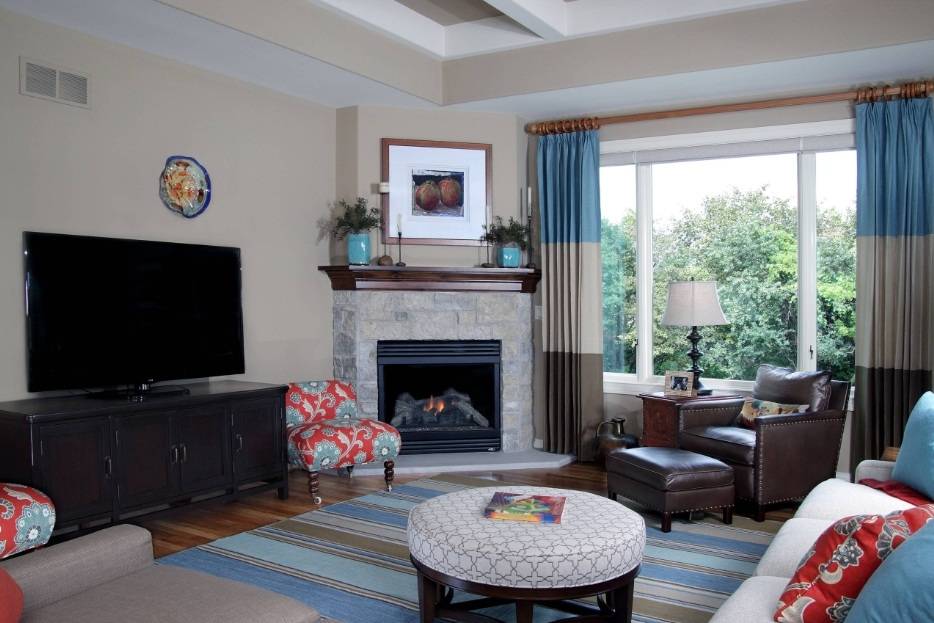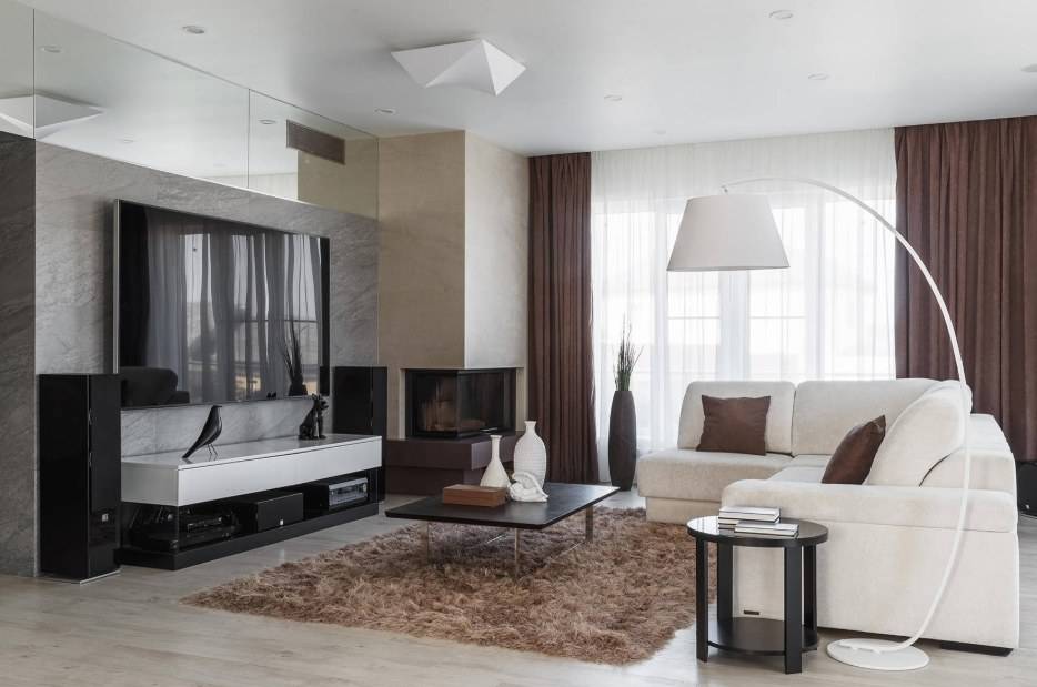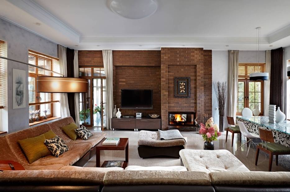 В большинстве гостиных телевизор — неотъемлемая часть жизни. В таком случае стоит разделить пространство в комнате на зоны. Например, камин расположить на другой стороне или стене комнаты, отделив эту зону журнальным столиком и одним или двумя креслами, поставив вазу с цветами. Допускается сочетание камин-телевизор, когда камин располагается под телевизором.