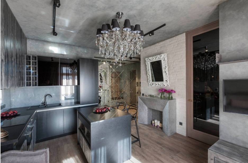 Также в интерьере кухни-гостиной с очагом прекрасно будут смотреться всевозможные кованые изделия, канделябры и оригинальные хрустальные люстры в которых будет отражаться и переливаться свет огня.