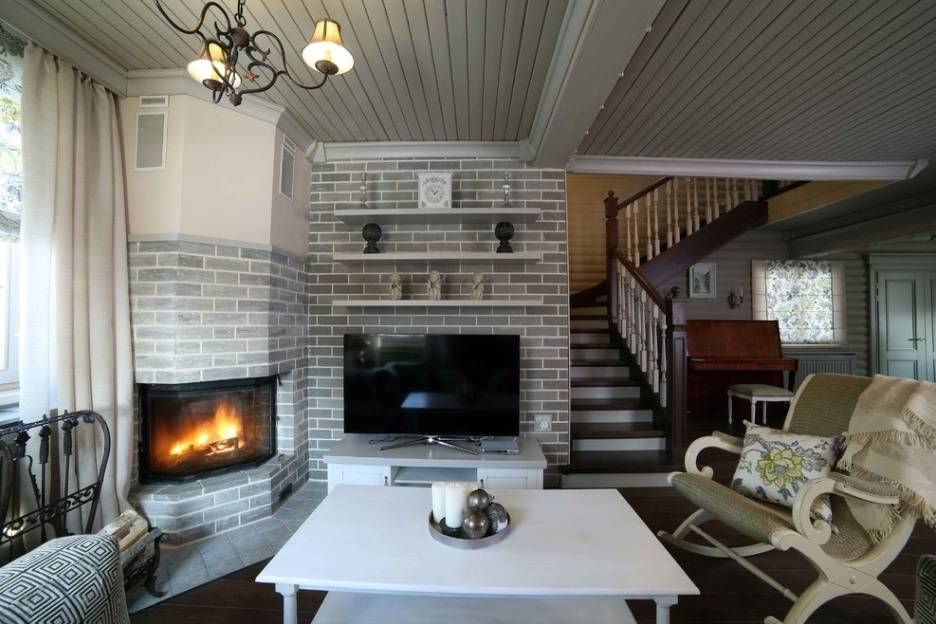 Прованс, кантри или рустик в основу ставит все натуральное или создающий данный эффект. Наиболее выгодным решением для такого дизайна станет стандартный угловой, встраиваемый или пристенный камин. Отличительной особенностью этих стилей является натуральность и естественность. Выбор стоит остановить на очагах с порталом под дерево, можно украсить его натуральными материалами или выделить зону соответствующими панелями.