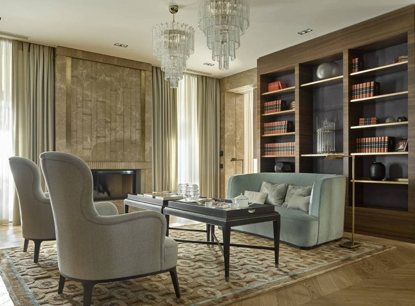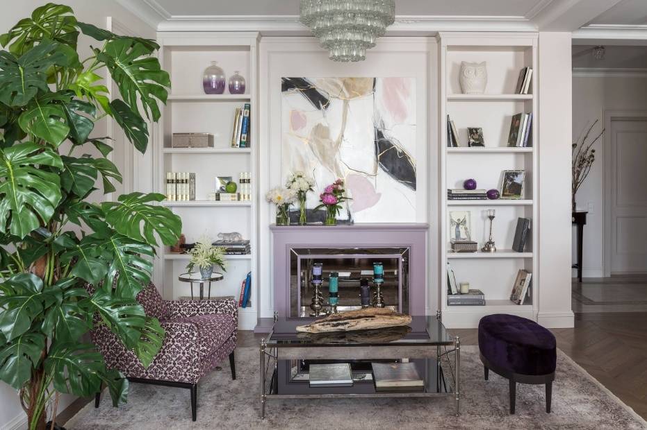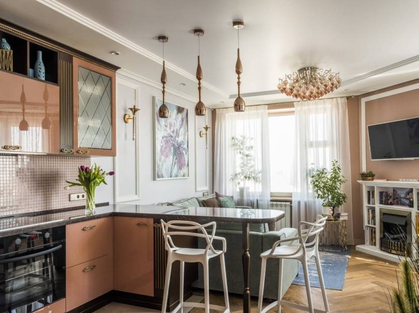 Камин станет центральным элементом кухни-гостиной в стиле арт-деко