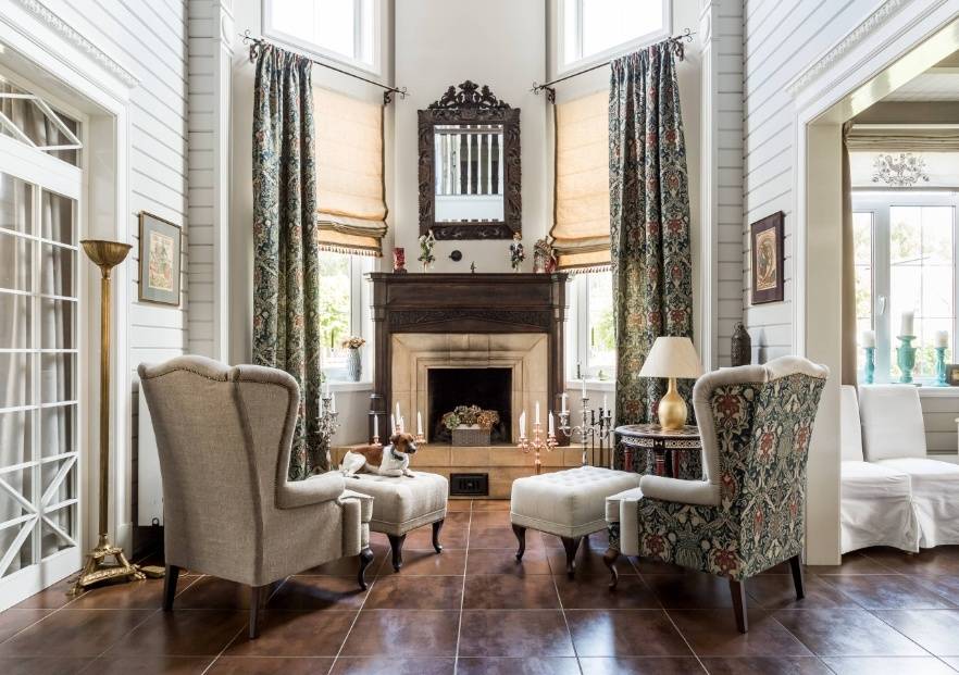 - Камин лучше всего располагать у стены перпендикулярной окнам.
