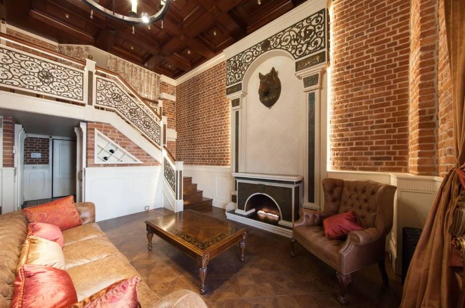 Настоящий кирпичный камин в классической кухне-гостиной с итальянским уклоном