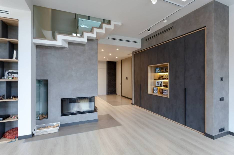 Встроенный. Находится в стене, иногда может быть даже двухсторонним на две смежные комнаты. Место под него желательно предусмотреть ещё во время строительных работ;