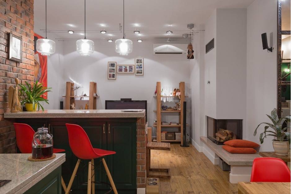 В этом случае можно устанавливать газовый, электрический или настоящий дровяной очаг. Понятное дело что такая конструкция станет центральным местом кухни-гостиной, соответственно и дизайн следует разрабатывать исходя из ее расположения.