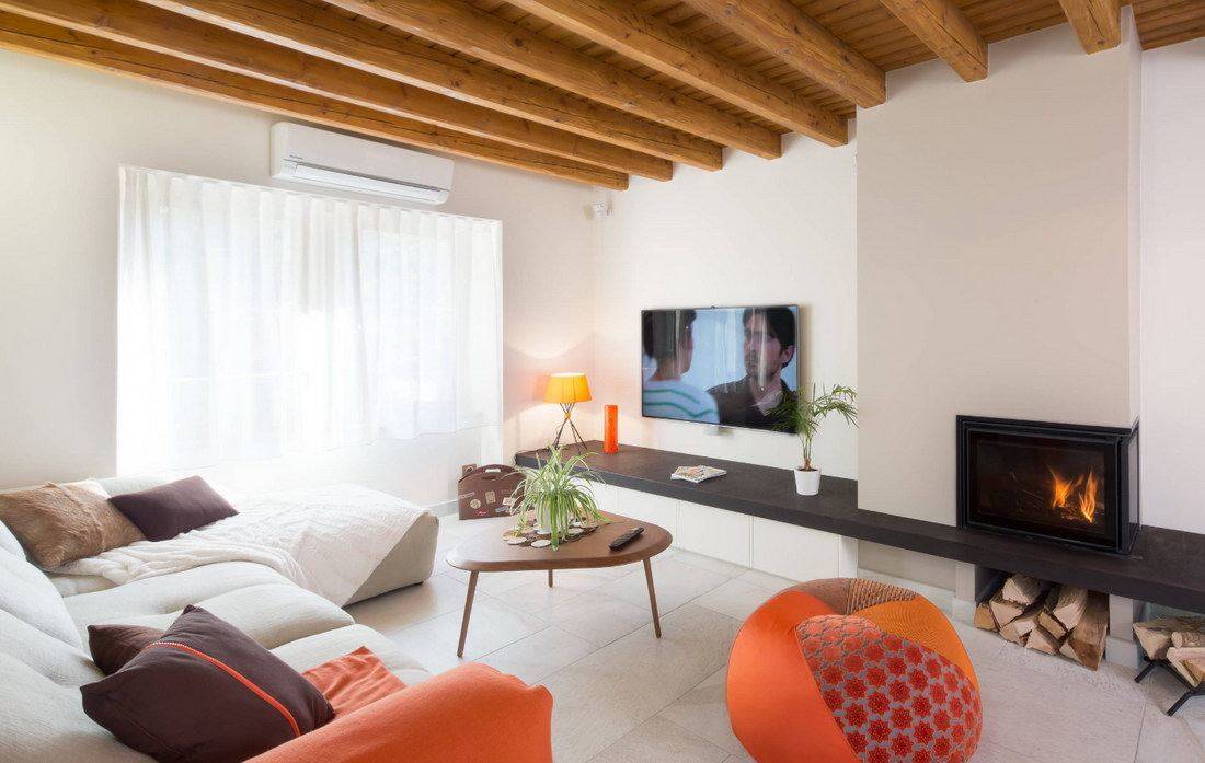 Стоит учесть еще один нюанс – наверняка у вас возникнет желание разметить в зоне гостиной телевизор. В данном случае лучше всего располагать технику у стены, находящейся перпендикулярно камину. Устанавливать телевизор над очагом не стоит, поскольку так объединяется две зоны гостиной и к тому же это не совсем безопасно.