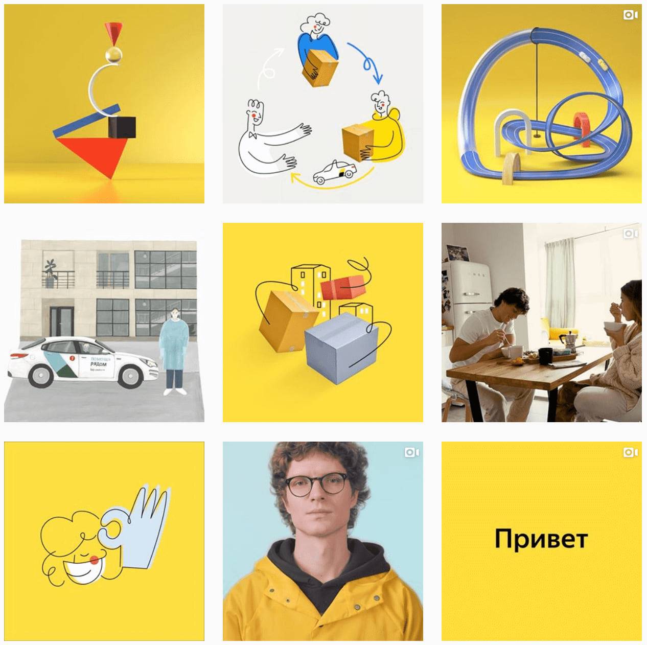 Или посмотрите, как этот прием применяет Яндекс Такси. Они используют фирменный желтый цвет и шахматную раскладку. Но при этом дополняют визуал фото, скетчами, 3D-графикой как на желтых клетках, так и на белых. Это создает целостность картинки, но при этом придает и свежесть, ведь сложно предугадать, что же будет дальше.
