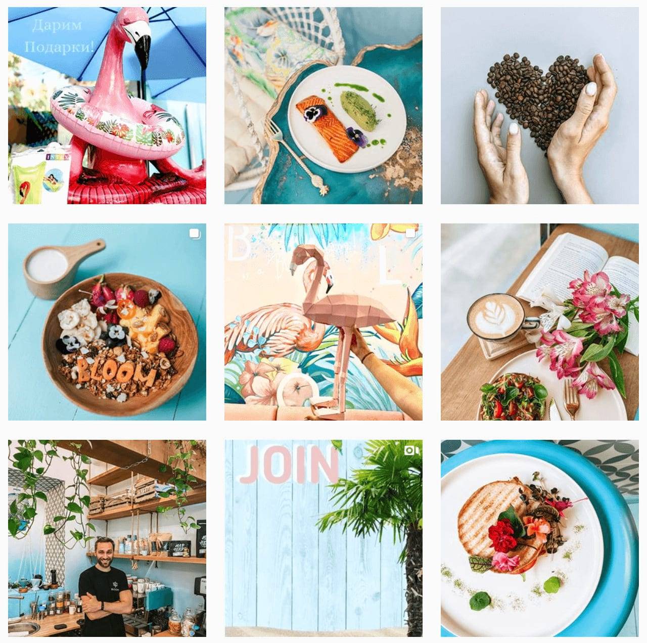 Или же возьмите аккаунт кафе Bloom. Тут все завязано на тропической тематике: фламинго, яркие цветы, лазурный цвет моря. Оформление уже задает определённое настроение, которое подкрепляет атмосферу заведения.