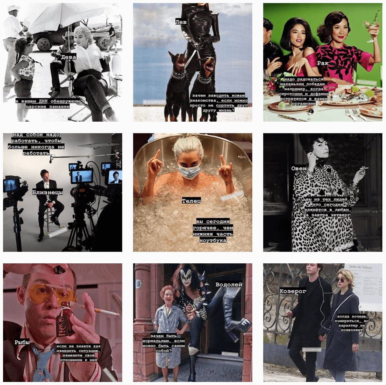 Возьмите, к примеру, аккаунт с дурашливыми гороскопами от Луладжи Олеговны. Какая идея – такое и исполнение, заметьте, тут нет ни фотосъемки, ни крутого дизайна Инстаграм. Однако, многократное повторение создает индивидуальный стиль. А талантливо подобранные шутки обеспечивают виральность. Это оформление настолько закрепилось, что некоторые аккаунты уже копируют его.