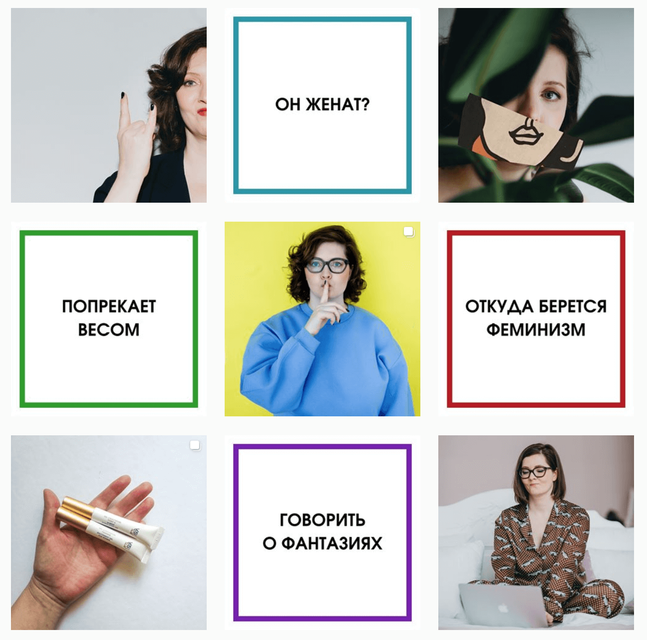 Если у вас упор на текстовый контент, то излишний визуал может перегружать аккаунт. Любители чистого дизайна и минимализма могут последовать примеру блогера Татьяны Никоновой. У нее всего 6 вариантов цветных рамок, а остальное составляют ее личные фото. Однако к Татьяне в аккаунт приходят не столько смотреть, сколько читать. И такой подход позволяет выделиться на фоне остальных и быстро сориентировать посетителя, о чем блог.