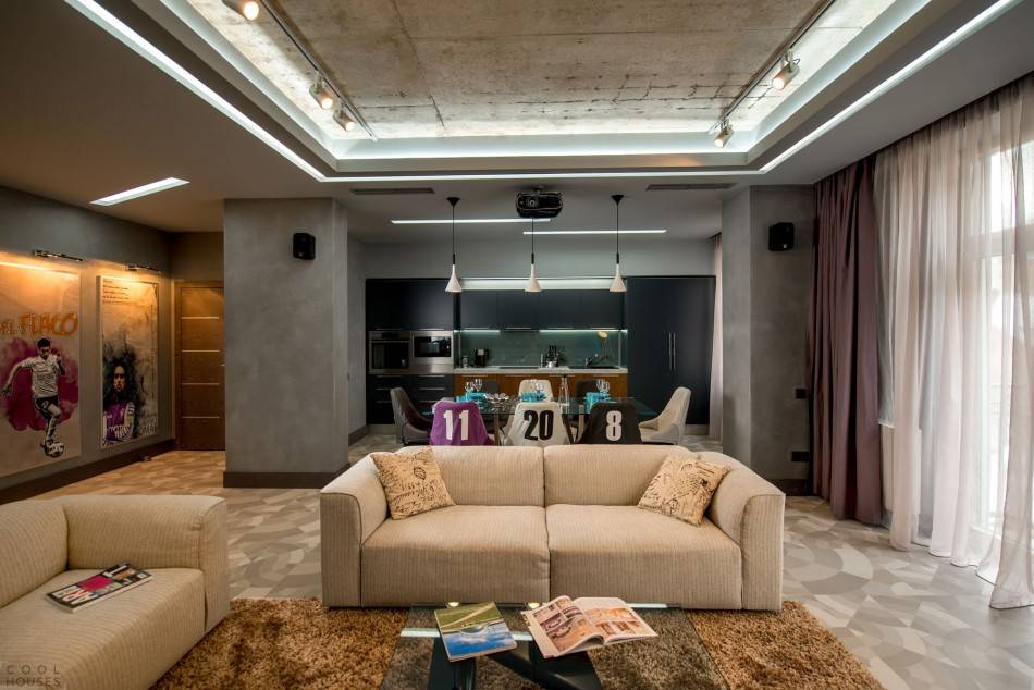 Как уже было сказано ранее, ключевой особенностью является изобилие источников света, ведь искусственные приборы освещения наполняют комнату светом, делая ее более просторной