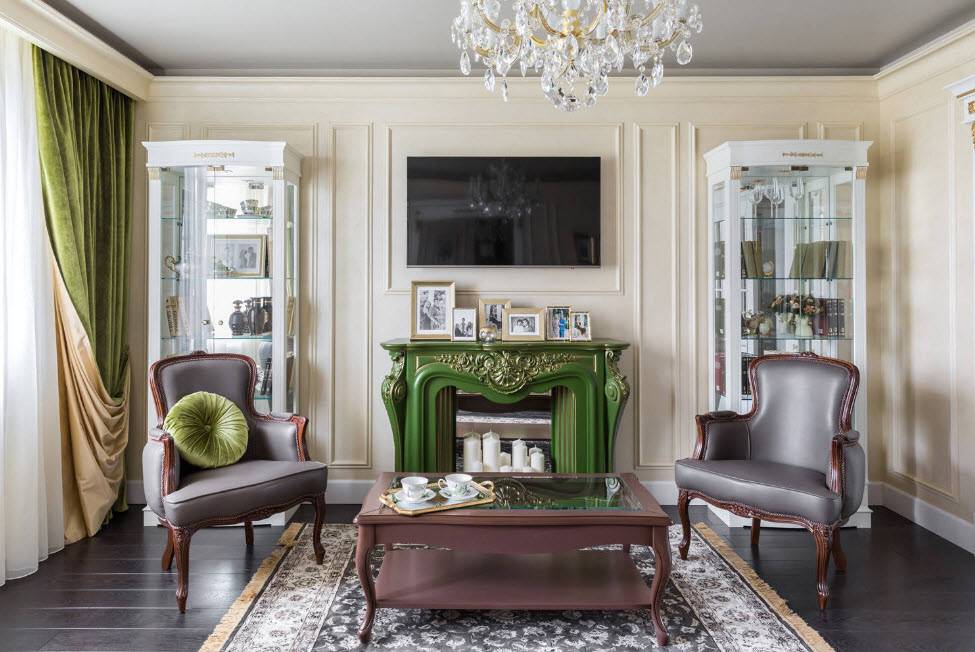 Как правило, классика подразумевает однотонные стены и минимум лишних деталей. Пол покрывается деревом, потолки часто декорируют лепниной. Светло, просторно и торжественно.