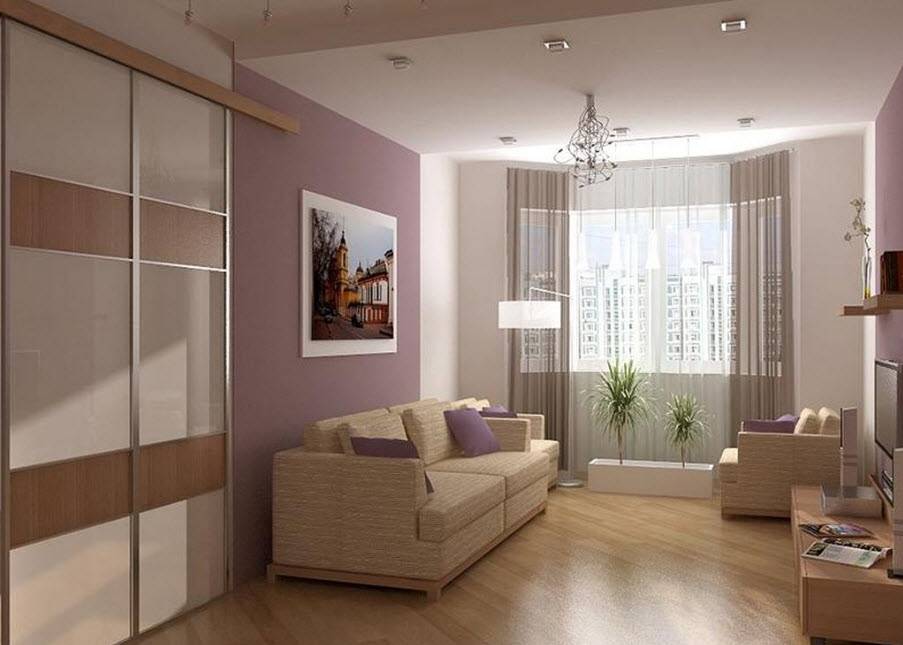 Что касается мебели, то она должна быть удобной и функциональной, лишние предметы лучше убрать. Разделяя небольшую гостиную на зоны можно использовать ширмы и перегородки, стеклянные или зеркальные элементы. Визуально увеличить пространство позволяет зеркала и глянцевые поверхности, натяжной потолок.