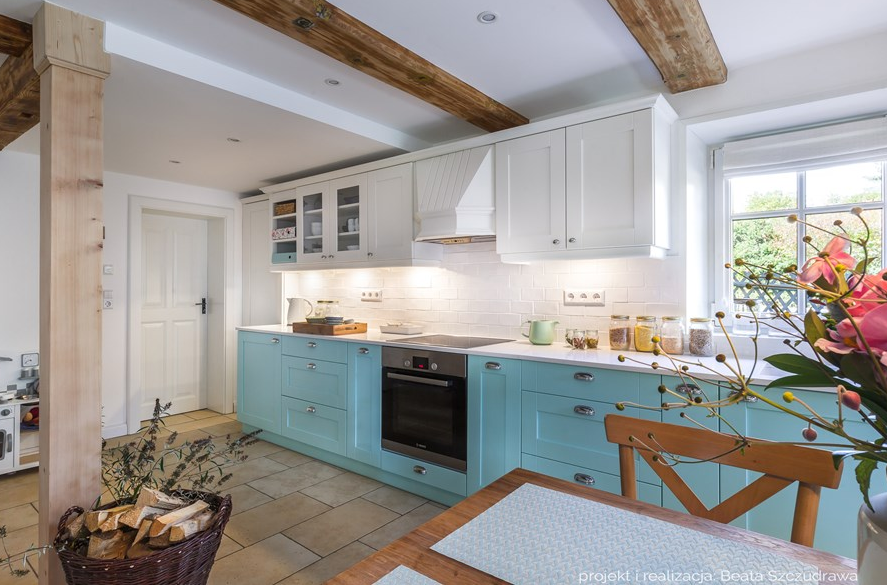Деревенская кухня – это синоним уюта, который всегда кстати! Ничего удивительного – в такого рода интерьерах царит теплая, тонкая палитра красок, шарм дерева и натуральных материалов. Поэтому, если вы мечтаете о вневременной кухне прямо из загородной усадьбы , вдохновитесь деревенской эстетикой! Простая деревянная мебель, потолочные балки, плитка, имитирующая каменный пол, и стилизованная фурнитура. Вышитые гобелены, кружевные шторы и плетеные корзины. Вот что вы обязательно можете найти на деревенской кухне. Кроме того, можно повесить букеты из сушеных трав под карниз и ароматную чесночную косичку. На полках разместить предметы «с душой» – миски из керамогранита, старинные утюги и масляные лампы.