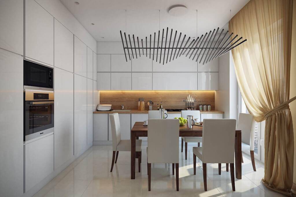 Оригинальная люстра и красивое сочетание стола и фартука на кухне в 12 кв.м.
