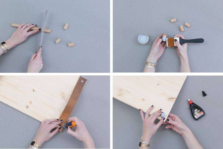 Обрабатываем при необходимости деревянную доску наждачной бумагой. После этого наносим краску в несколько слоев и оставляем до высыхания. Из пластиковой трубы отрезаем четыре отрезка одинакового размера. Приклеиваем их с обратной стороны доски по углам.