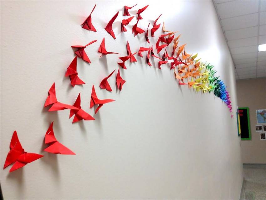 Декоративные панно можно сделать из ткани или пряжи. Однотонную мебель можно украсить бабочками, вырезанными из бумаги: это придаст вашей комнате благоухание красоты и непосредственности. Можно расписать стены сакурой, а розовые лепестки аккуратно вырезать из бумаги и наклеить на стену.