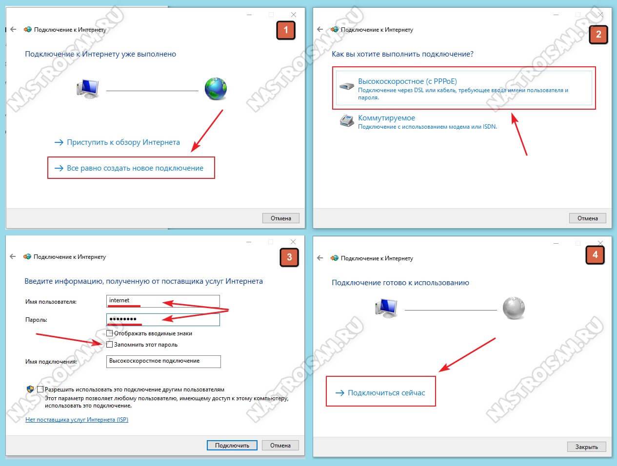 Внимание! Обязательно поставьте галочку «Запомнить этот пароль», иначе при подключении система будет постоянно требовать его ввести заново. После того, как подключение к Интернету без роутера будет создано, его надо будет запускать каждый раз, когда нужно выйти в глобальную паутину