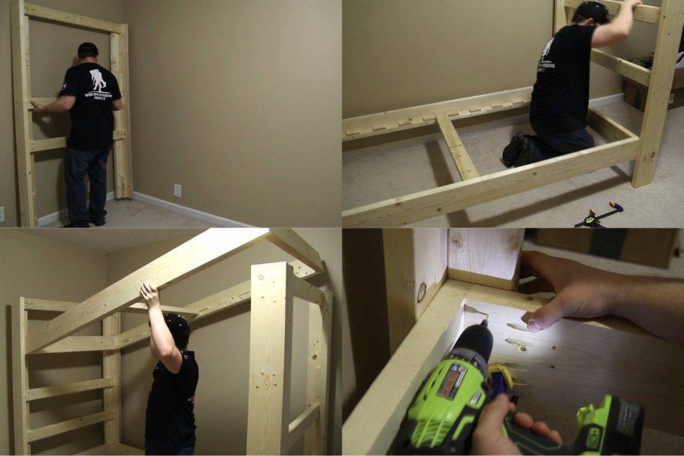 Чтобы собрать двухъярусную кровать из деревянных заготовок, выполняют такие шаги: