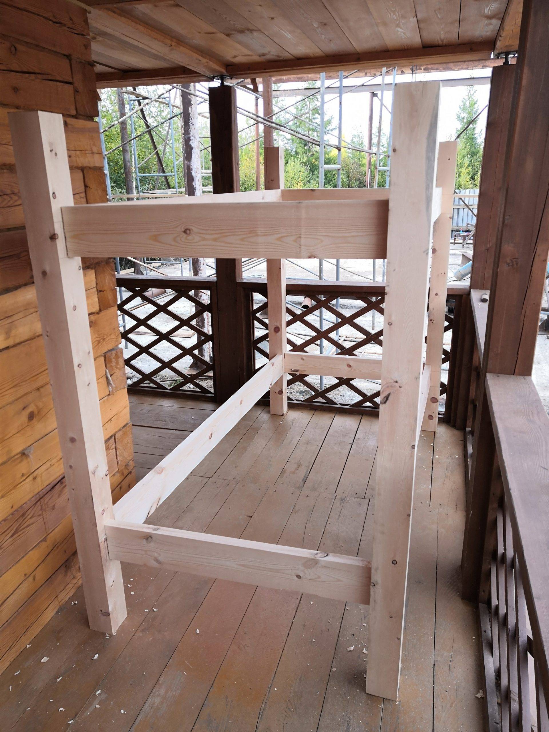 Для изготовления ножек используются бруски толщиной 50-100 мм, которые соединяют попарно. В итоге должен получиться торец по типу полочки, причем длина ножки совпадает с высотой ограждения верхнего яруса.