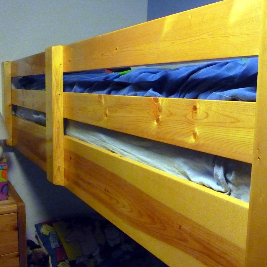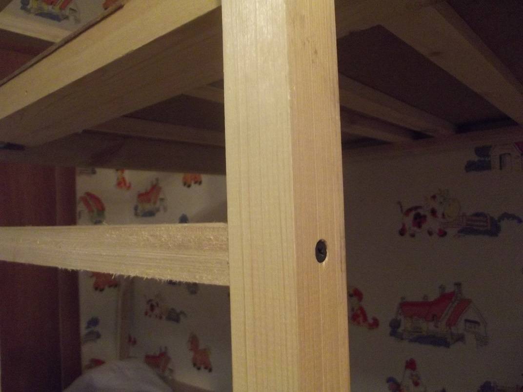 Шаг 13. Далее лестницу нужно просто надежно зафиксировать на основании кровати, и работы закончены. Не стоит забывать и о бортике безопасности, который нужно прикрепить в обязательном порядке вдоль спального места. Крепление производится при помощи болтов. Стоит отметить, что кровать можно покрыть лаком или краской для придания ей нужного цвета. Перед нанесением красочного слоя следует покрыть дерево грунтом.