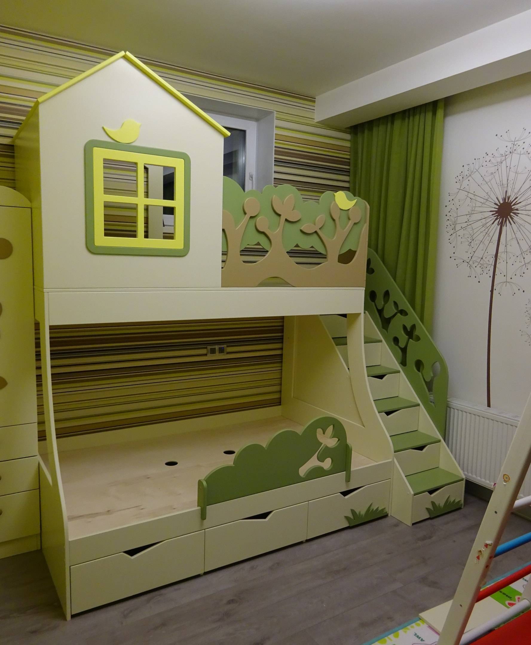 Продумать декорирование кровати необходимо до начала изготовления, так как оно может значительно изменить проект. При наличии определенных навыков можно выполнить мебель в виде машины, домика или любого другого объекта. Более простым, но не менее популярным вариантом является оборудование кровати шведской стенкой, канатом и брусьями. Также часто встречается монтаж горки для быстрого спуска.