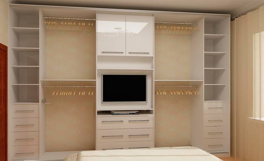 Длина шкафа. Она обычно выбирается такая, насколько позволяет пространство комнаты, то есть от стены до стены или от стены до ближайшего дверного или оконного проема.