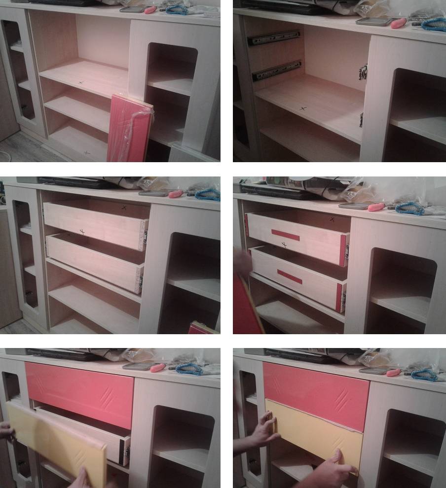- Крепится фурнитура, навешиваются и выравниваются фасады.