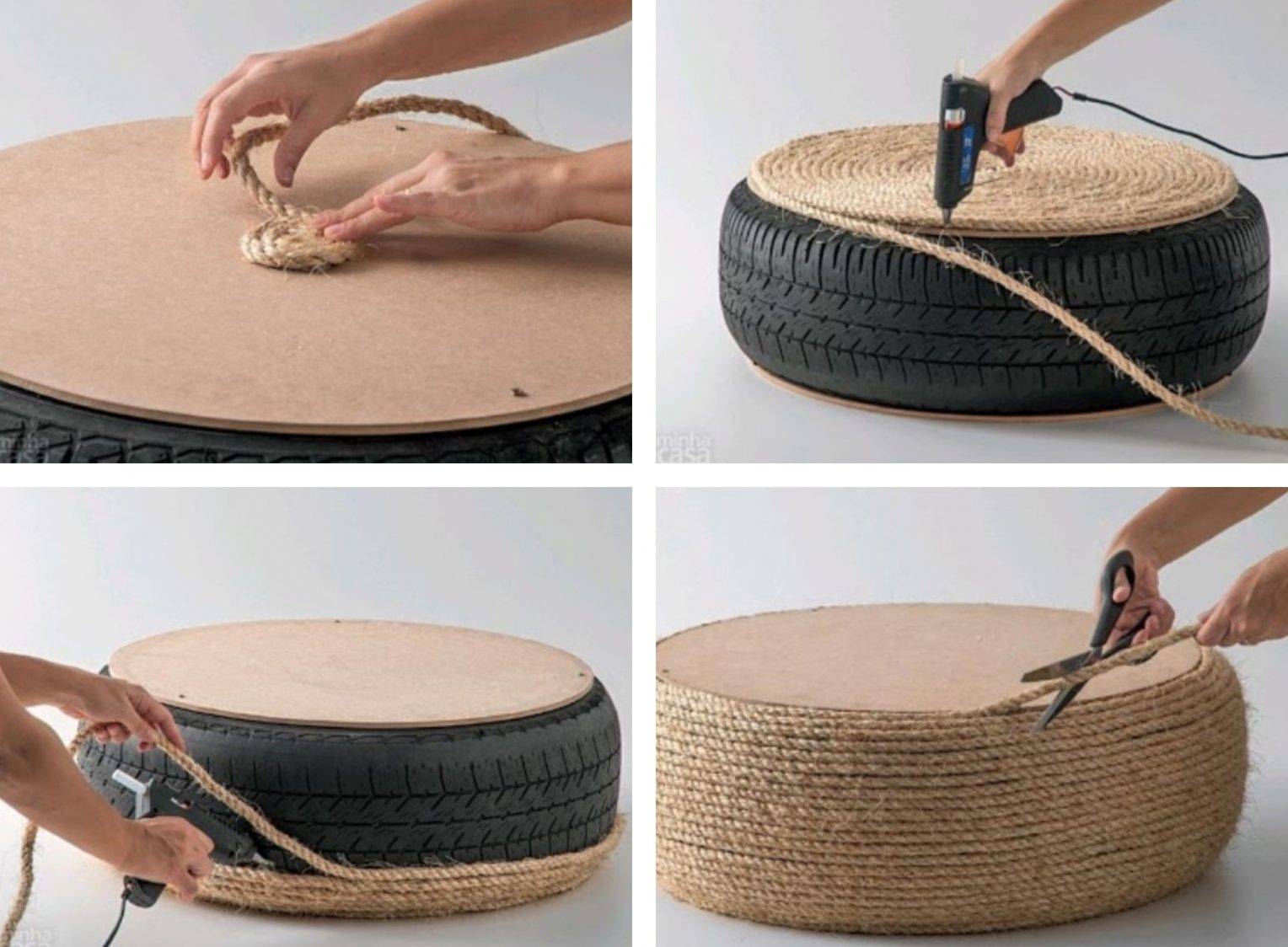 Для изготовления понадобятся: целое колесо без повреждений, ДСП, декоративная толстая пряжа, клей, шурупы и шуруповерт.