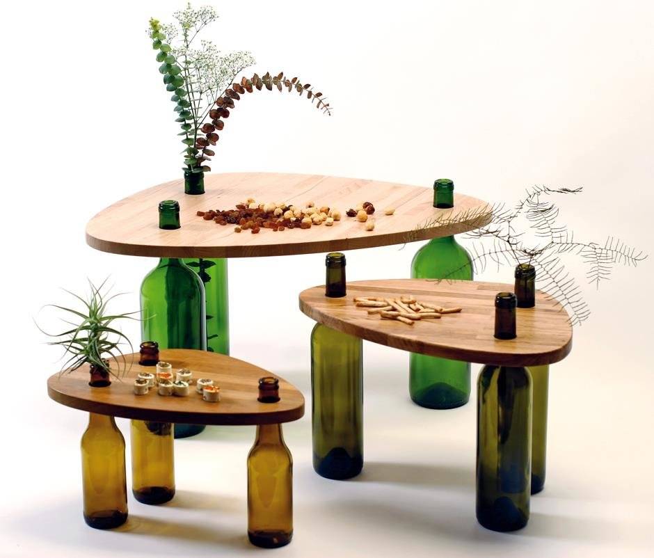 Самый невероятный и удивительный способ – это использование обычных стеклянных бутылок для создания журнального столика. Для этого понадобятся: фанера, лобзик, уровень, наждачка, дрель.