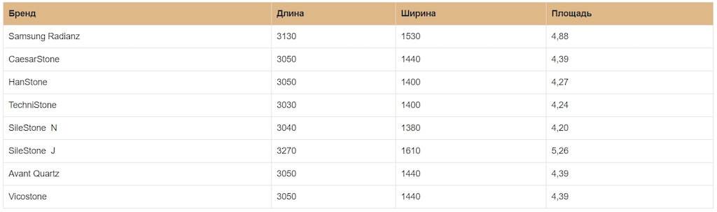 Кварцевый камень производится в форме плит, которые принято называть слэбами или слябами. Размер слэбов у всех производителей примерно одинаковый — 3000х1400 мм.