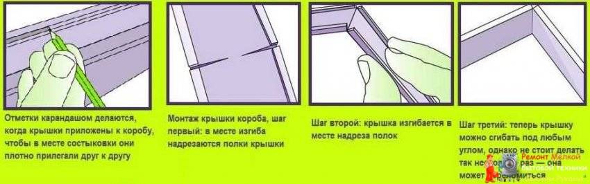 При прокладке коробов следует тщательно производить замеры и проявлять аккуратность при резке. Золотое правило, о котором не следует забывать, во избежание брака, резку следует производить при закрытых крышках. Следует знать, что резку пластиковых профилей и крышек необходимо производить ножовкой по металлу или болгаркой. Во избежание образования сколов и трещин в местах резки, использование для этой цели кусачек или ножниц по металлу не допустимо.