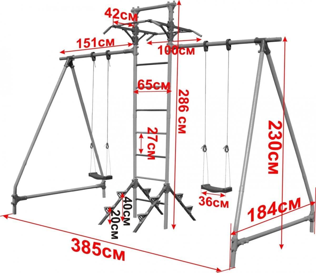Если есть желание разнообразить досуг не только детей, но и взрослых, можно сварную (сборную) конструкцию детских уличных качелей для дачи своими руками дополнить шведской стенкой с турником.