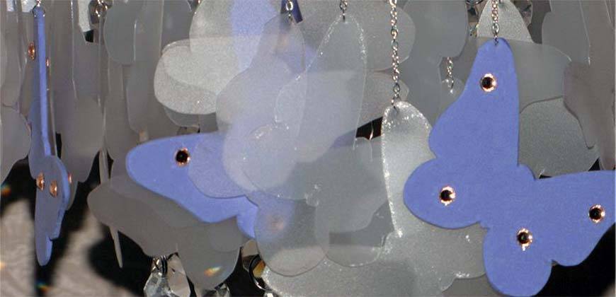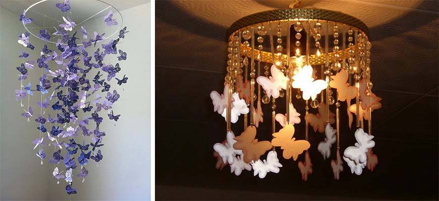 Наиболее распространенным вариантом изделия является люстра с бабочками. И это неспроста. Начнем с того, что такой вариант выглядит роскошно и дорого, а во-вторых ее изготовление не требует особых физических затрат. Таким образом, в создании люстры может участвовать даже ребенок.
