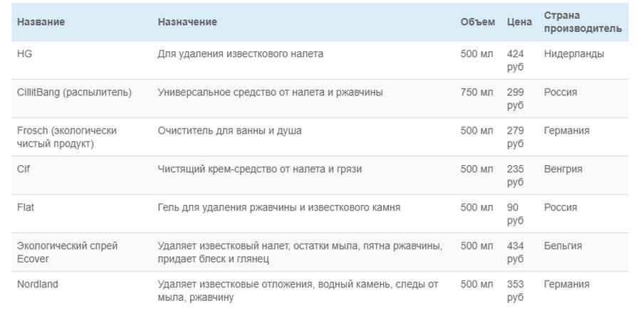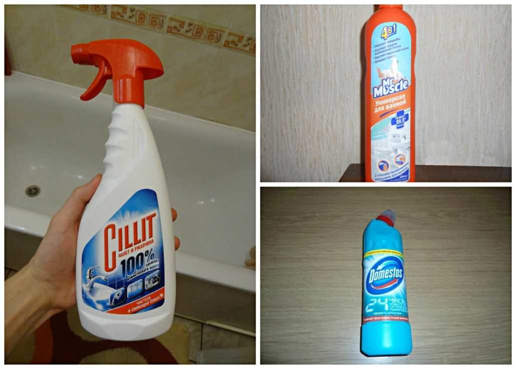 В магазинах есть большой выбор средств которыми можно очистить плитку в ванной. Часть из них импортного, часть — отечественного производства. Есть специальные составы для очищения от известкового налета, есть те, которые называются «для ванн и душевых».