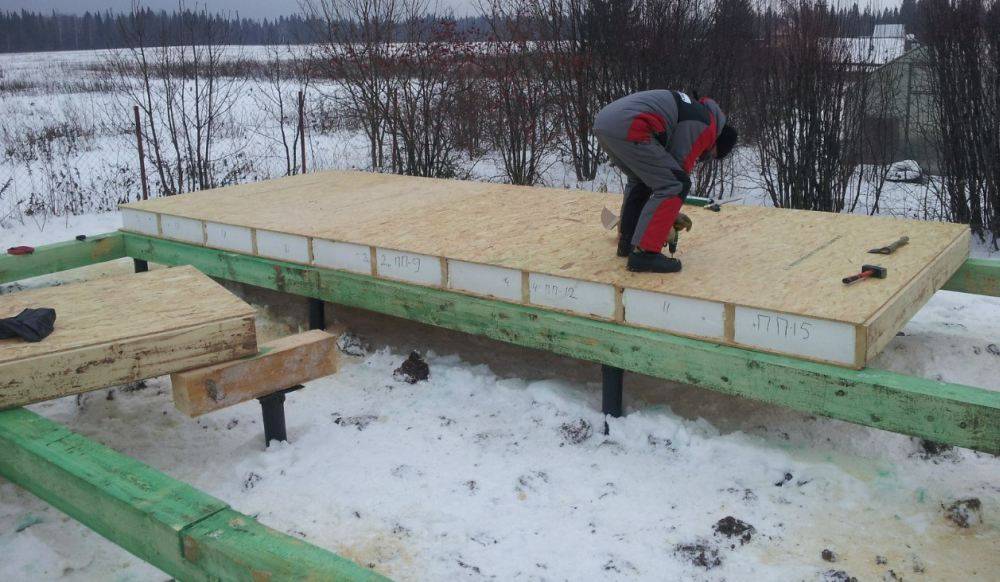 Первое перекрытие – это пол, который не требует дополнительного утепления. Соберите СИП-панели 224х625 мм. Такая ширина балок, расположенных с шагом ~60 см, позволяет выдержать нагрузку конструкции.