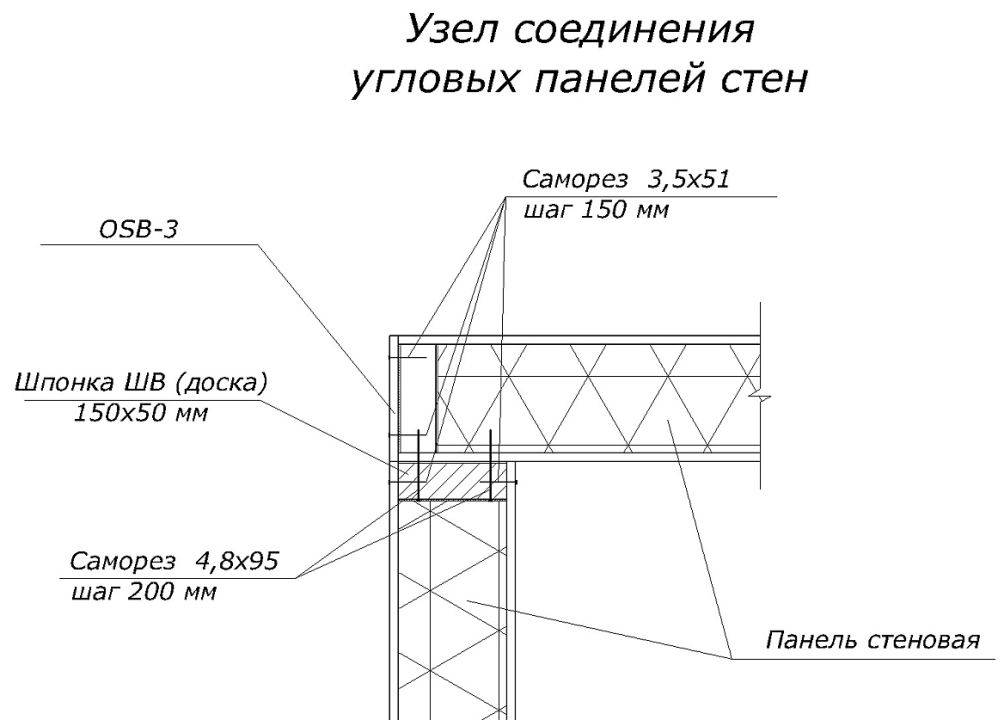 Панель другой стены фиксируют на шпонке саморезами 3,5 мм, выдерживая шаг не более 150 мм. Выступающую часть плиты OSB закрепляют на торце стеновой панели аналогичным образом.