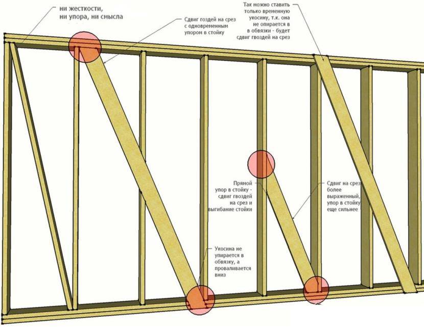 Устанавливают укосины под углом 45-60°, вырезая для них пазы в каркасе. В местах выпила их дополнительно фиксируют двумя гвоздями. Для стен длиной до 6 м достаточно две укосины, направленных от центра нижней обвязки к двум верхним углам. Для стен большей длины их количество также можно увеличить.