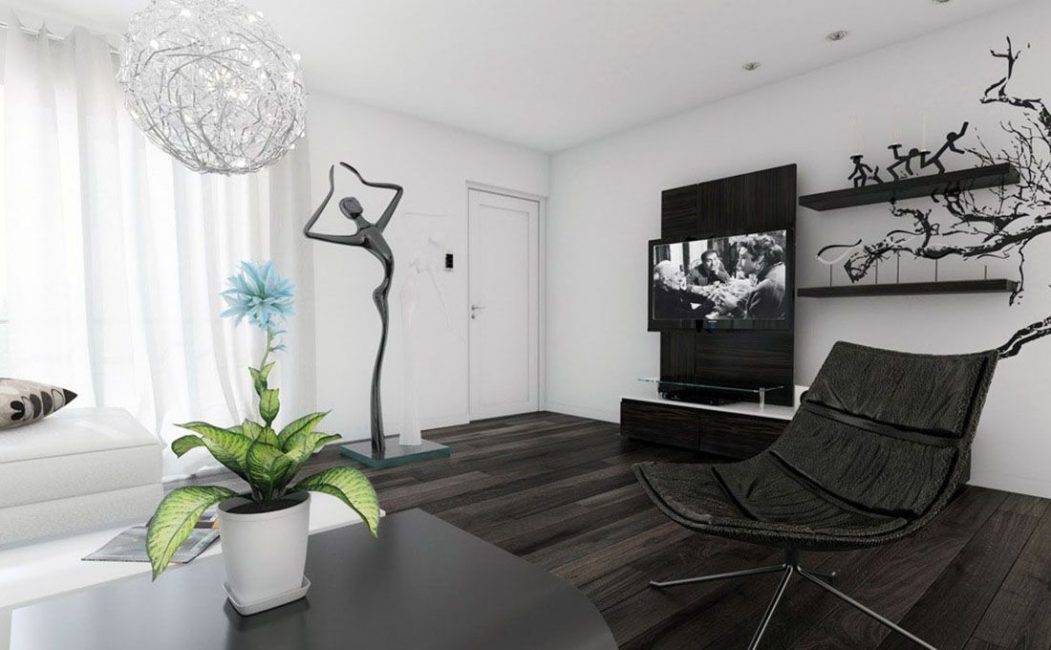 Обычно для создания оригинального интерьера достаточно лишь одной, центральной стены в темных тонах. На ее фоне можно установить мягкий уголок в гостиной, интересную стенку с витриной из стекла под старину, полки с белым фарфором. Идеальным будет соблюдение такой пропорции: ¾ светлых оттенков и ¼ темных.