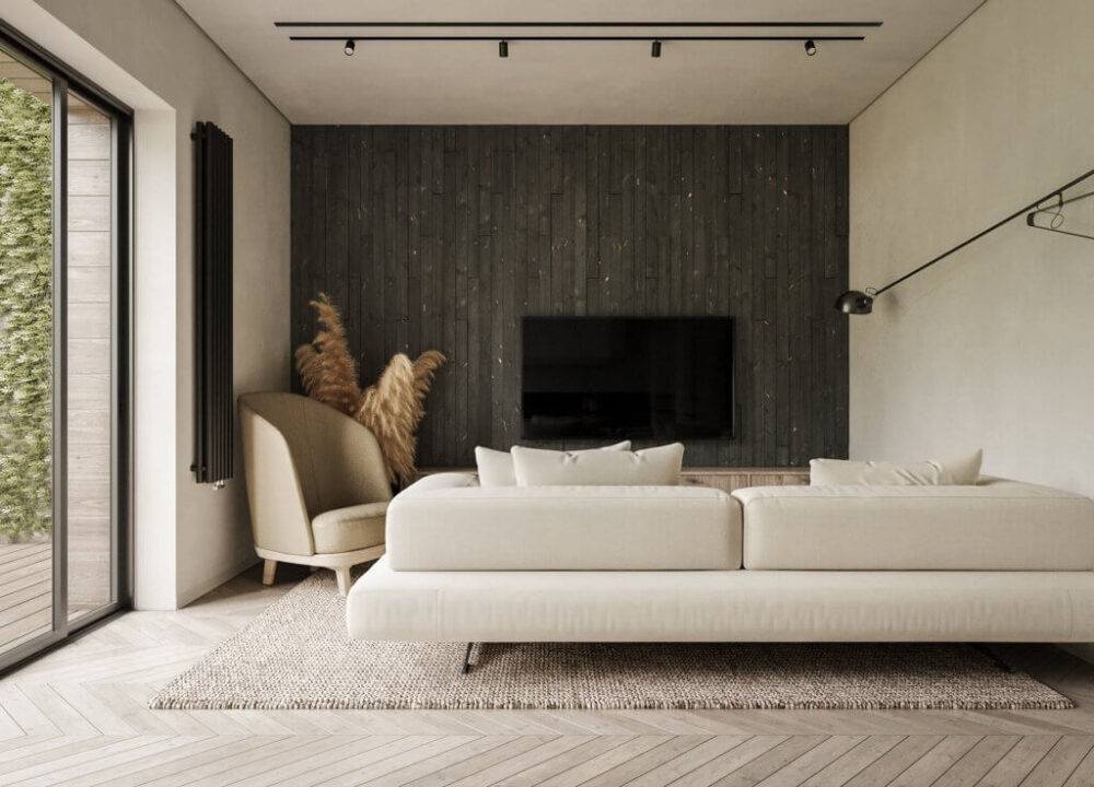 Деревянная мебель в гостиной в черном интерьереИсточник rehouz.info