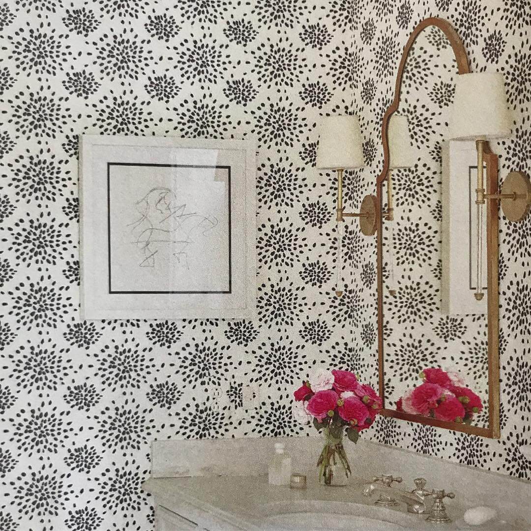 Черно-белые обои в интерьере ванной. Мелкие крапины на белом фоне добавляют «воздуха», а букет розовых цветов оживляет помещение. Эффектно смотрится и абстрактная черно-белая картина для интерьера.