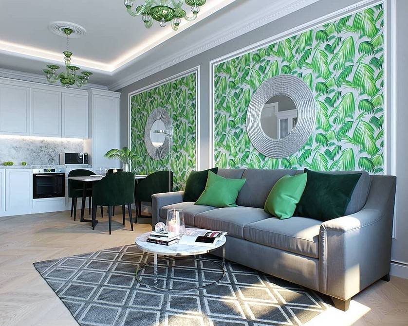 Не забывайте обращать внимание на его температуру: если к зеленому добавлено большое количество желтого — лучше подбирать теплую базу, например, бежевую. Если зеленый холодный, то и окружение должно быть таким же, подойдет даже более насыщенный тон зеленого