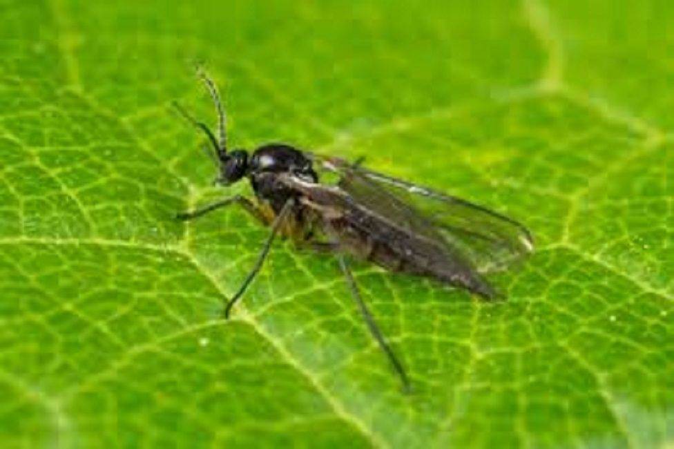 Эти вредители похожи на мелких комаров или летающие экземпляры тли чёрного цвета. Размеры – до 2 мм.