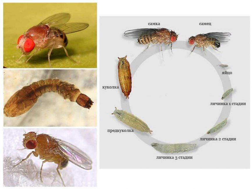 Дрозофилы очень быстро плодятся. Всего за 10 дней происходит развитие от яйца до взрослой особи. Уже на следующий день после появления из куколки дрозофила откладывает яйца, и за свою жизнь она может отложить до 2 тыс. яиц. С такой скоростью размножения дрозофилы быстро отвоёвывают пространство в квартире, и хотя они довольно безобидны и не кусаются, но растерявшиеся жильцы экстренно выискивают эффективные способы от них избавиться.